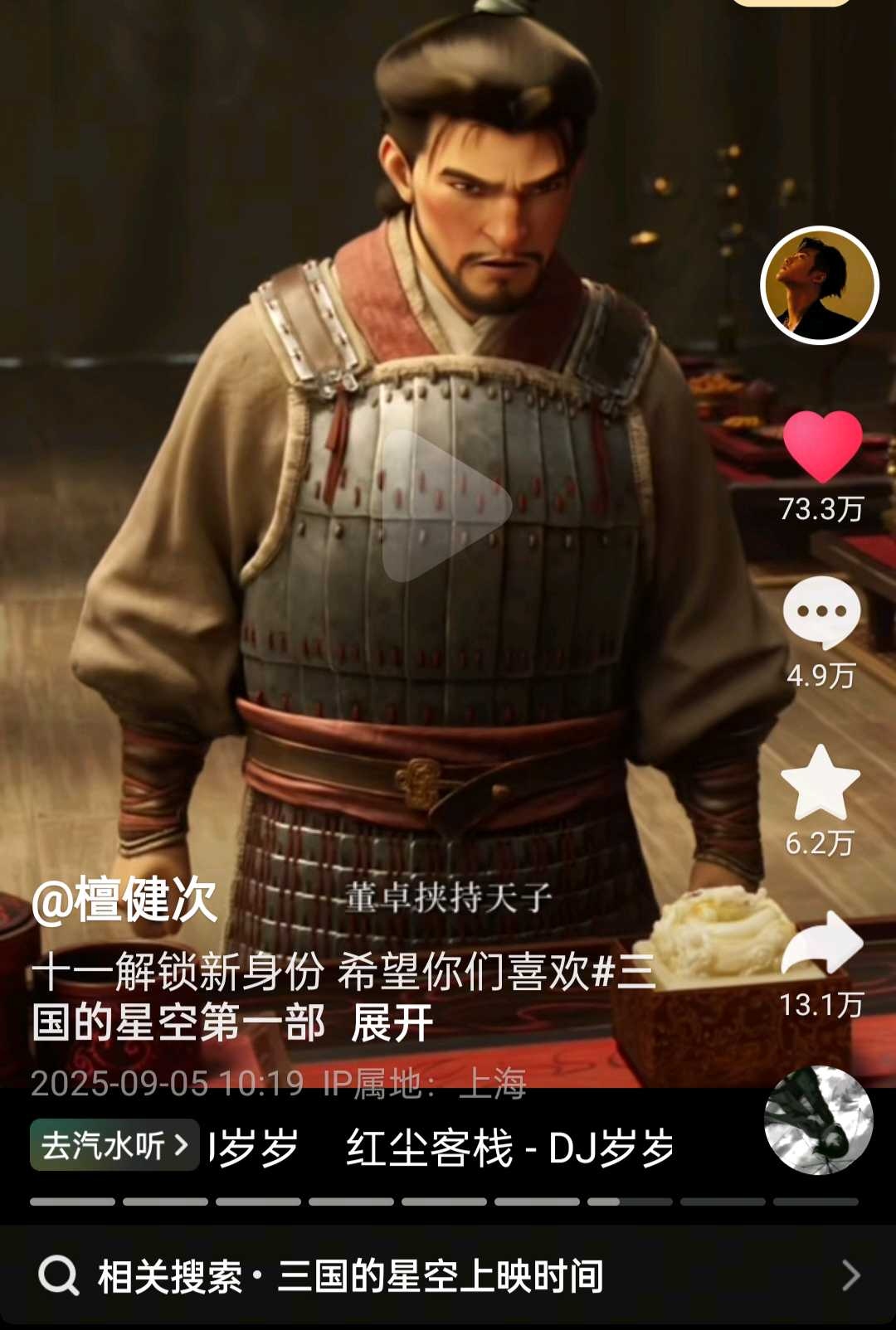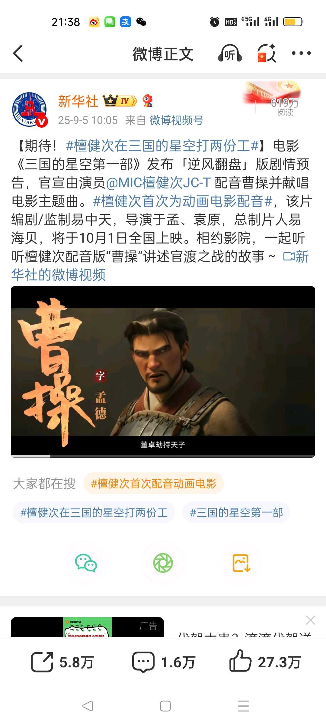 该电影最新变化是9月5日发了第二轮预告片,并获得新HS、央视等官方MT力挺,新HS官微9月5日发:【期待!#檀健次在三国的星空打两份工#】电影《三国的星空第一部》发布「逆风翻盘」版剧情预告,10月1日全国上映,相约影院,一起听听檀健次配音版“曹操”讲述官渡之战的故事。该条微博获点赞27.3万,另外当日檀健次通过抖音发视频确认为《三国的星空第一部》配音,获点赞超73万,显示出观众对影片的认同与期待。新HS帮助电影宣发较为罕见,其重点强调价值导向与传播效能,而非商业宣发的普遍合作,但往往会形成“官方定调+流量共振”,对影片可信度与声量提升显著,官方背书对引导家长带孩子观影也有很好促进作用。