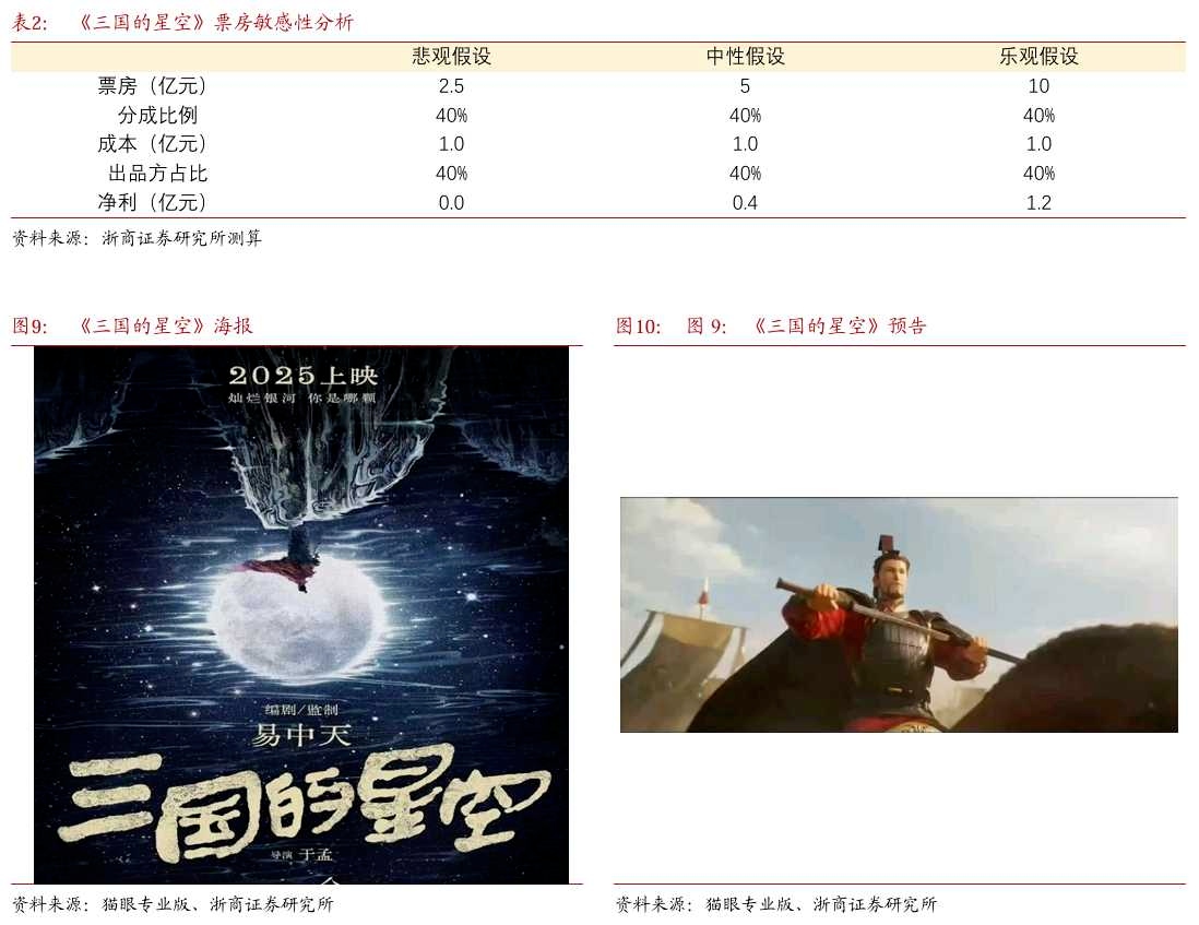 公司的IP变现业务不只是今年十一档即将上映的电影带来的收益,首先电影《三国的星空》后面会有2-N部,会持续带来收益,另外围绕电影会有很多IP衍生品的相关收入,持续贡献利润,IP衍生品一般采用"保底分成+销售额抽成"组合,现在《三国的星空1》已确定的IP衍生品项目有游戏IP授权和联动,授权网易的三国题材大型游戏《率土之滨》,并将在十一档共同宣发,共同造势!《三国的星空》获得游戏行业头部企业网易认同,证明其品牌影响力和成为爆款的潜力。《率土之滨》与《三国志·战略版》并称国产三国SLG双雄,长期占据榜单前列与高讨论度,《率土之滨》累计用户已突破8000万,行业与平台口径显示其长期处于“千万级活跃”梯队。《率土之滨》是长期位列网易收入前列的核心产品。在《三国的星空1》上映国庆窗口,与《率土之滨》做“电影主题赛季+联名内容+影内广告”的立体联动,既能借势电影热度拉动游戏DAU与留存,也能为电影触达核心三国用户,实现双赢!相关链接:网页链接