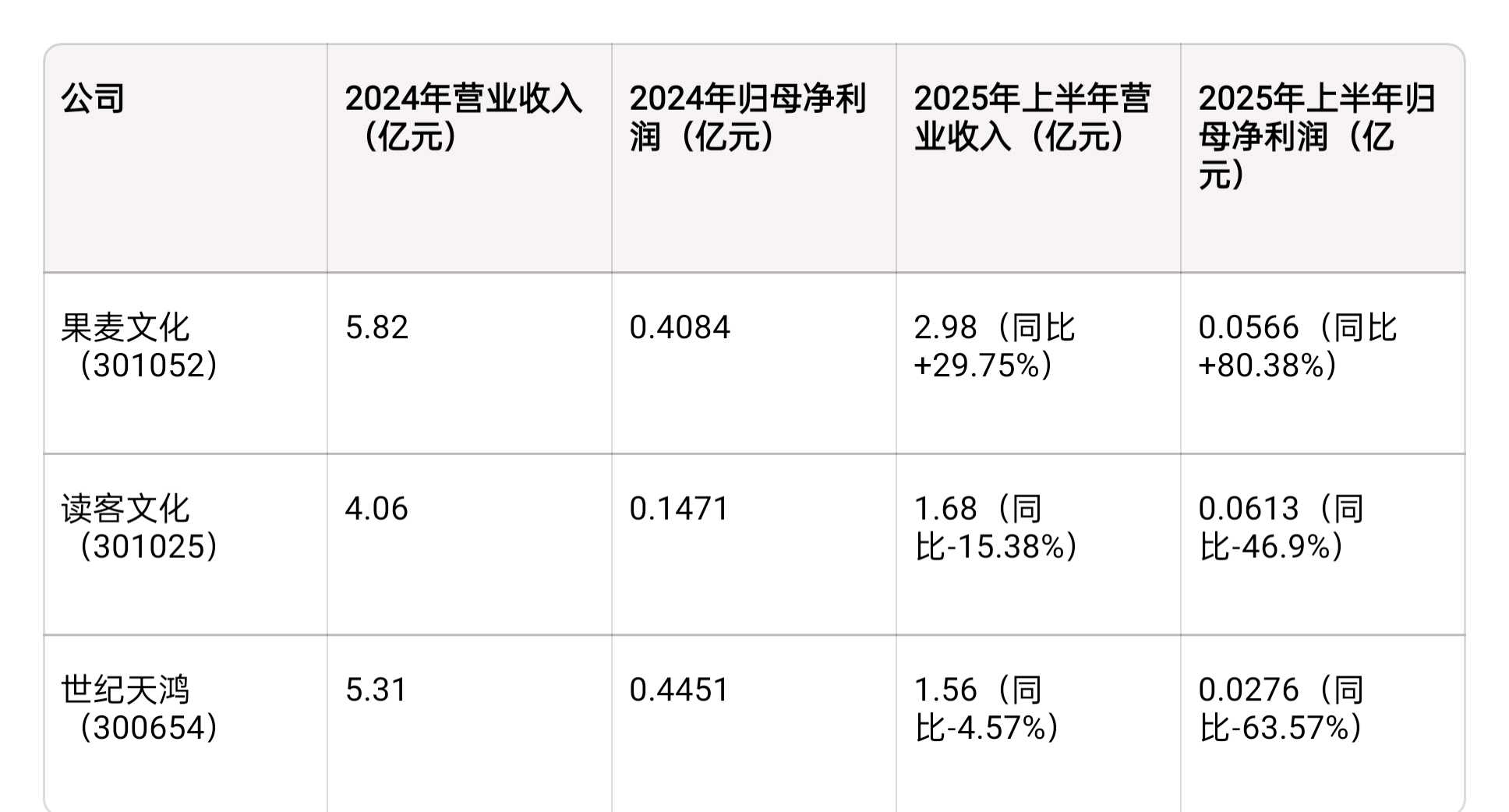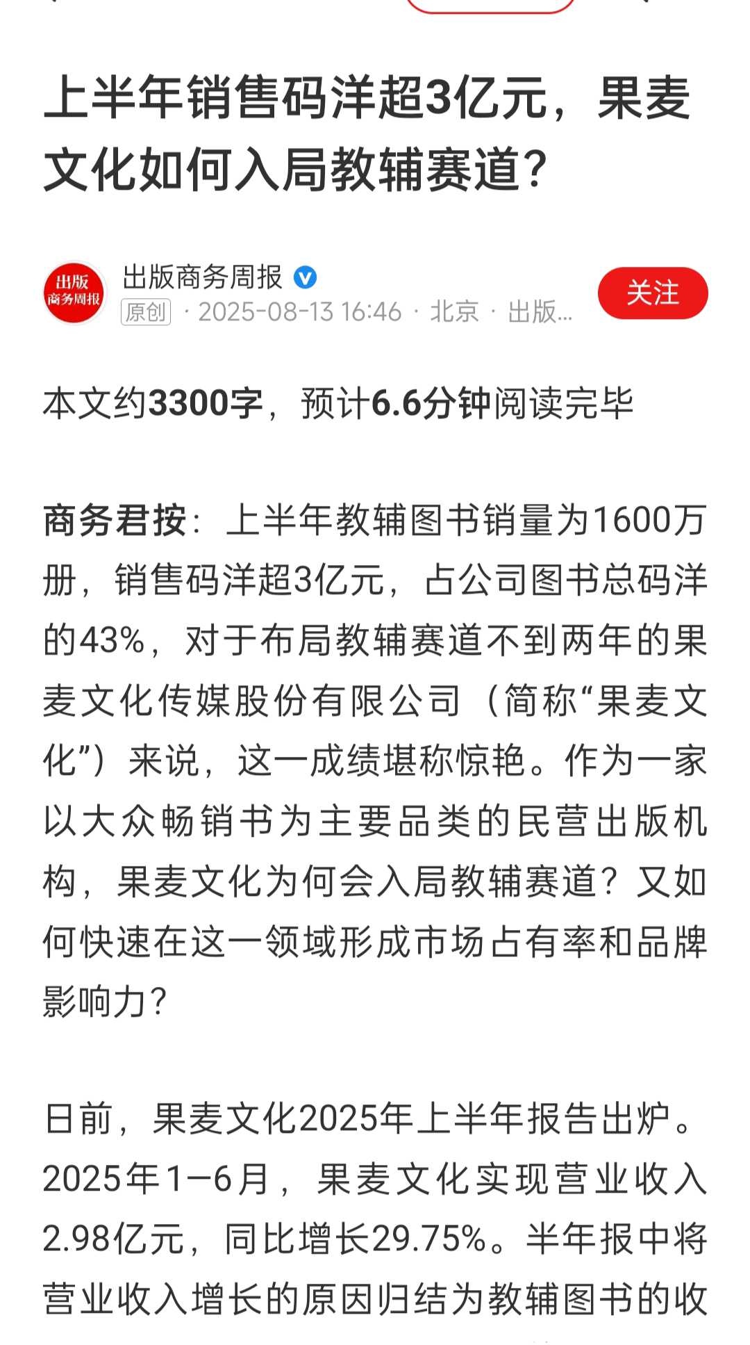公司从23年底开始布局壁垒很高的教辅赛道,不到两年时间已取得重大突破,今年8月13日出版商务周报发文《上半年销售码洋超3亿元,果麦文化如何入局教辅赛道?》链接:网页链接,上半年教辅图书销量为1600万册,销售码洋超3亿元,占公司图书总码洋的43%,对于布局教辅赛道不到两年的果麦文化来说,这一成绩堪称惊艳。