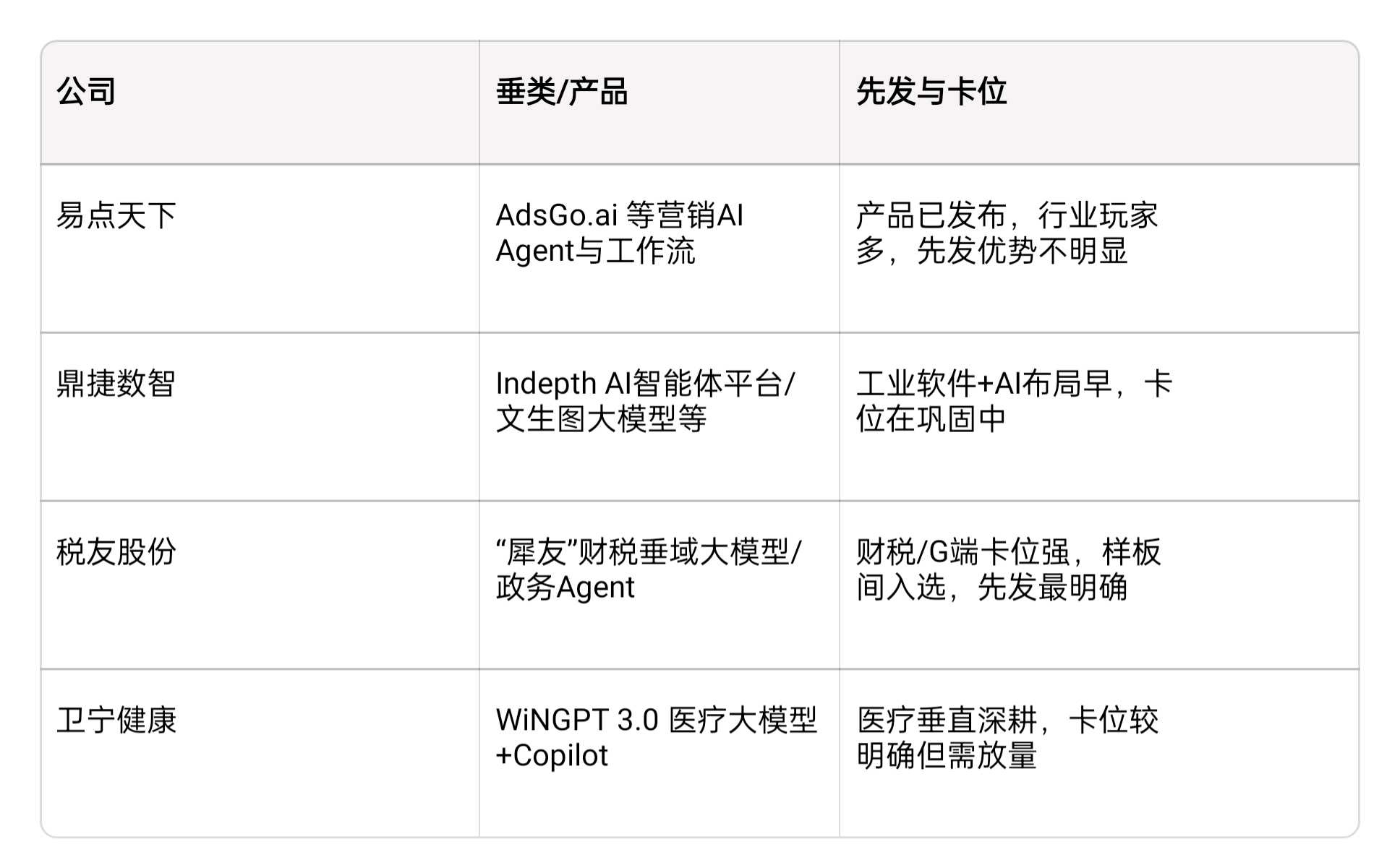今年5月东吴证券发布深度研究报告《AI Agent深度:2025 Agent元年,AI从L2向L3发展》:那些在特定垂直赛道已经建立深厚领域知识壁垒、拥有清晰商业模式和客户基础的垂直Agent提供商具有较高的短期增长潜力。我们总结了30家上市公司在垂类Agent方面的布局,其产品基本符合Agent定义且具有垂直领域的比较优势。例如出版校对(果麦文化)、电商外贸(焦点科技)、美学设计(美图公司)等。建议关注其利用AI Agent解决具体行业痛点的能力和商业化进展。