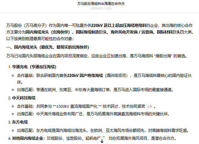问了下豆包,万马股份海上风电海缆料出海,可能的合作方?