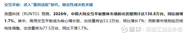 洛图科技(RUNTO)预测,2026年,中国大陆交互平板整体市场的出货量预计达130.8万台,同比微增1.7%。其中,商用交互平板成为核心增长极,出货量将达53.3万台,同比增长7%;而教育市场则经历结构性调整,出货量将为77.5万台,同比下滑1.7%。