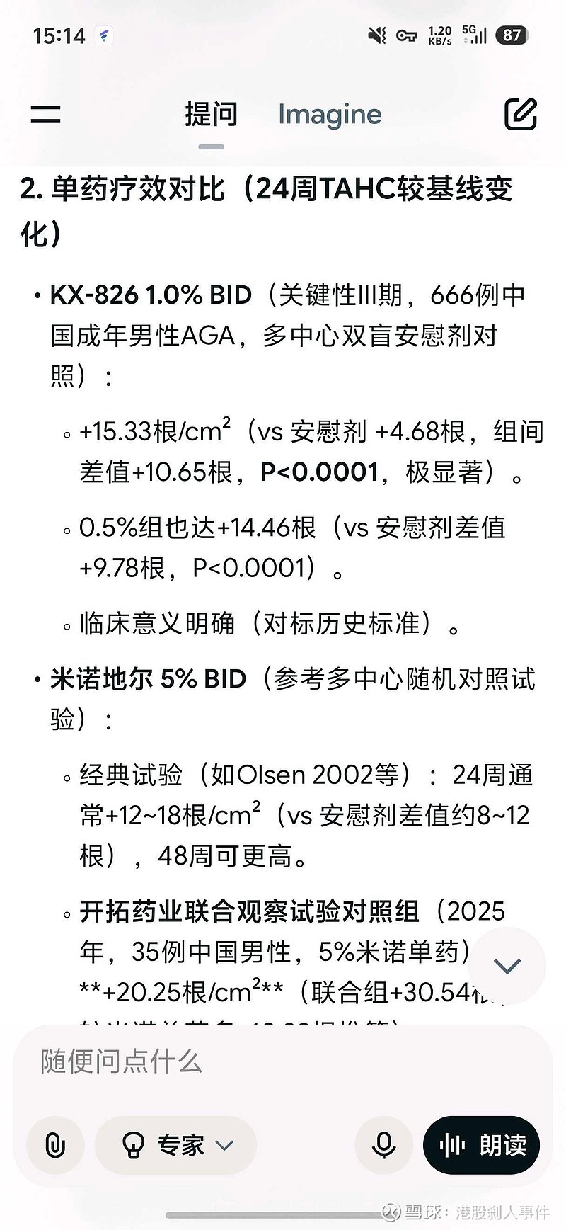 $开拓药业-B(09939)$ 静下来仔细分析数据才发现,暴跌可能是因为一是相比米诺地尔增发优势不明显,不太可能替代米诺地尔,二是1%浓度与0.5%浓度相比增发效果基本没差,导致提高浓度加强增发效果这条路也走不通了。总而言之,药上市没问题但能抢下多少市场就不好说了,估计还得看看与米诺地尔联用效果如何,如果联用能大幅提高增发效果那可以绑定米诺地尔一起卖,单靠826自己是没啥市场潜力了