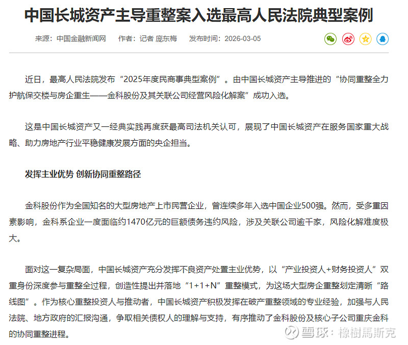 $*ST金科(SZ000656)$ 金科从重整到摘帽这一系列运作是百分百一定会成功的。诸君请看下述表述,2月24日,最高人民法院对外通报2025年人民法院民商事审判工作总体情况并发布5起典型案例。”最高法在阐述案例典型意义时表示,法院针对房企集团化、多层级、跨区域、关联度高的特点,以恢复企业价值、保障购房人与债权人利益为目标,坚持整体处置。最高法表示,该案的成功处置,为大型上市房企风险化解、集团企业协同重整及法治化保交楼提供了示范参考。