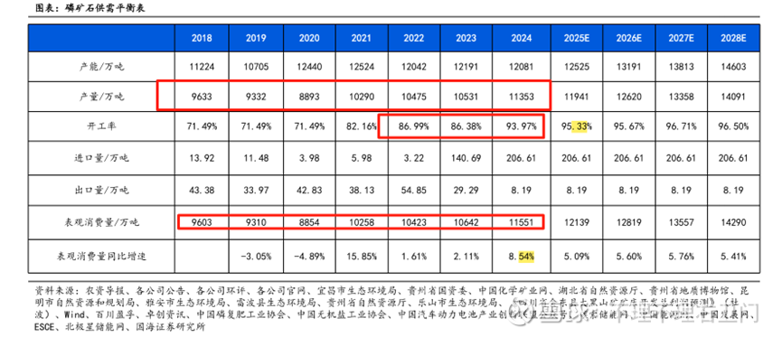 1-根据券商提供的供需平衡表,近年来磷矿石消费量和产量基本都超10000万吨以上,企业开工率超过90%;预计未来需求侧仍将保持5%左右的增速。