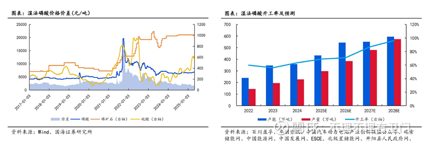 3-受益动力电池、储能等领域的发展,磷酸铁锂电池需求旺盛。据中国汽车动力电池产业创新联盟数据,2024年我国动力电池累计装车量548.4GWh,累计同比增长41.5%。其中磷酸铁锂电池累计装车量409.0GWh,占总装车量74.6%,累计同比增长56.7%。高工产研锂电研究所(GGII)统计数据显示,2024年中国储能锂电池出货量为335+GWh,同比增长64%。据券商不完全统计,截至2025年4月现有+拟建湿法磷酸项目产能共649万吨,预计20242028年湿法净化磷酸产能CAGR为13.54%。券商预计2024-2028年湿法磷酸产量CAGR为25.97%,2025-2028年净化磷酸开工率分别为69%/71%/87%/96%。