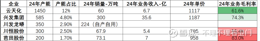 1-从产能情况来看,上市公司中云天化产能1450万吨排第一,芭田股份200万吨产能排在第五位;不过行业公司磷矿石生产多为自用,单独销售的量占比较小;对外销售中兴发集团以300万吨的销量排第一,不过从毛利率来看,芭田股份毛利率83%排在第一,公司在磷矿石的对外销售中拥有较大的成本控制能力(单价并不高)。