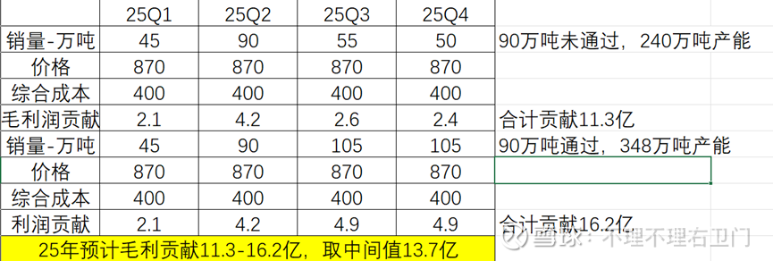 1-按照24年情况磷化工毛利贡献5.9亿,化合肥毛利不变的情况下,25年新增毛利润在5.4-10.3亿,中间值预计7.8亿。Wind一致预期12亿的净利润,比24年增长8亿,很大概率就是今年90万吨产能通过,接近上限348万吨,毛利贡献16.2亿,对应增量10.3亿毛利,8亿净利---一致预期较为乐观,预期差较小。