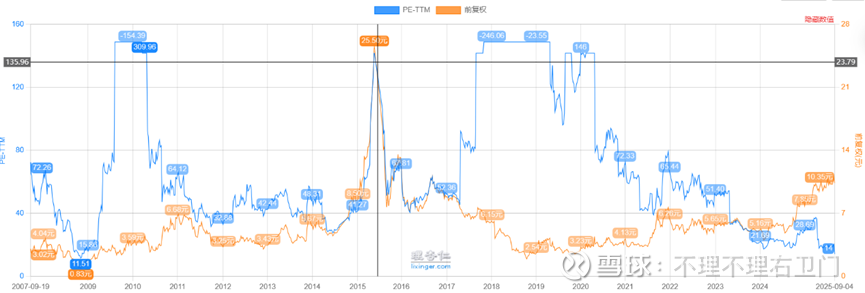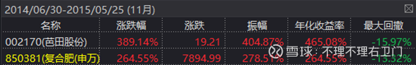 2:14年6月-15年5月,经历大牛市,期间涨幅超380%,复合肥指数涨幅也超260%,跑出较强的超额;期间利润依旧个位数下滑,估值一路飙升至超135倍---牛市猪都能起飞。