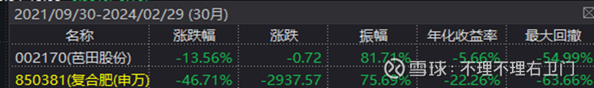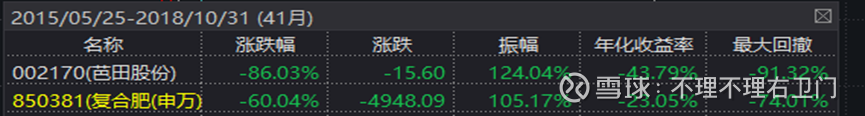 3:15年5月-18年10月,大涨之后开始超过3年的下跌,期间公司跌幅超86%,复合肥行业指数跌幅超60%;同时期间净利润超过双位数下滑,估值也下杀---业绩估值双杀