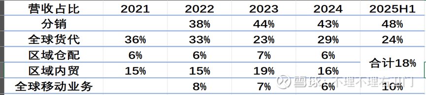 3-业务结构:按营收贡献来看,分销业务是营收贡献主力,从22年的38%增长至最新25H1的48%;全球货代作为第二大收入贡献业务,贡献度有所下滑,25H1占比24%,区域内贸则是15%左右占比,区域仓配业务和全球移动基本保持6-7%的收入贡献,这三者贡献比较稳定。