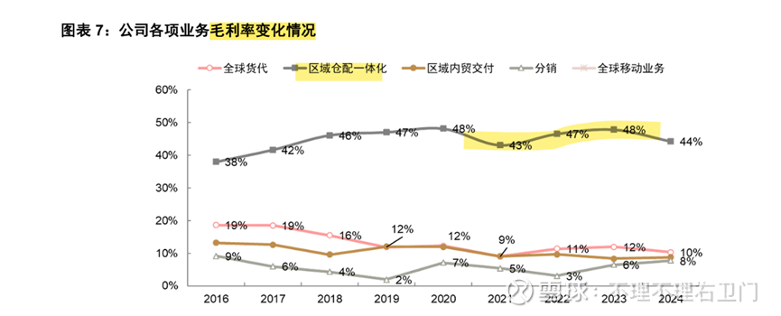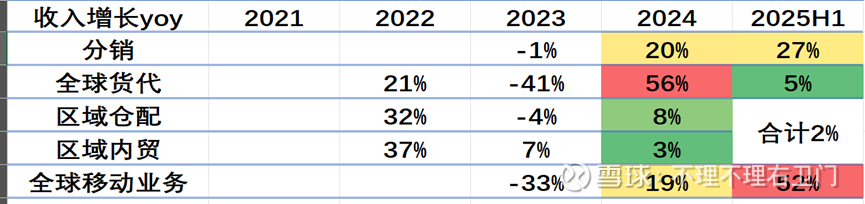 从收入增长来看,23年货代和全球移动业务遭遇大幅下滑,24年也随之反弹最大;分销一直保持20%+的增长,区域仓配和内贸业务则是基本个位数增长。