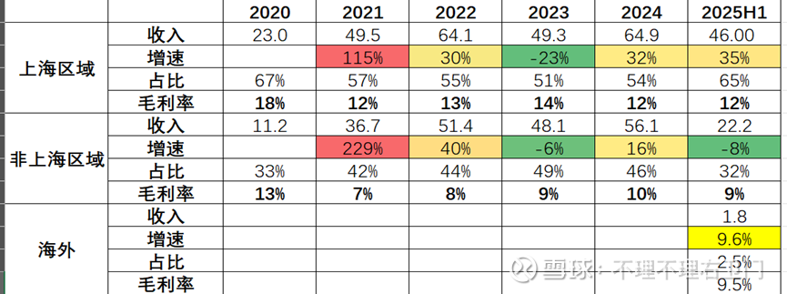 从区域分布来看,上海区域占比一半,同时贡献主要增长,毛利率也相比非上海区域高2-3个百分点;海外拓展还在进行中,目前收入占比还不足3%。