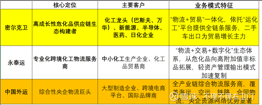 密尔克卫属于垂直领域(化工行业为主),主要竞争对手是永泰运和中国外运。中国外运主要是综合央企物流巨头、永泰运是专业化跨境化工物流服务商,密尔克卫则是危化品物贸一体化综合供应链平台。