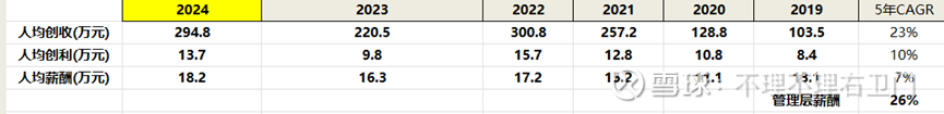 4-人均效率:除23年业绩大幅下滑外,整体人均效率都在提升中;不过人均薪酬7%的复合增长,管理层是26%的复合增长,差距有点大。