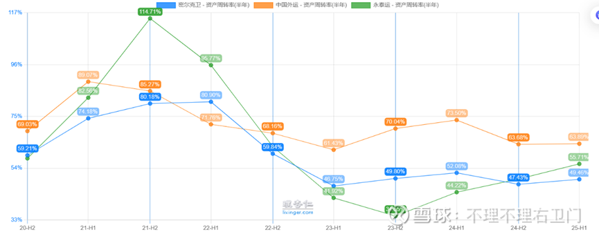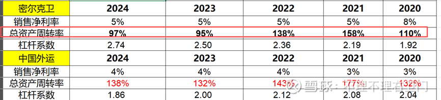 1-资产周转率:行业资产周转率从22年开始均有较大程度的下滑,23下半年开始有所恢复,中国外运的恢复度最高,密尔第二,永泰运最低---行业资产周转效率都还有提升空间。