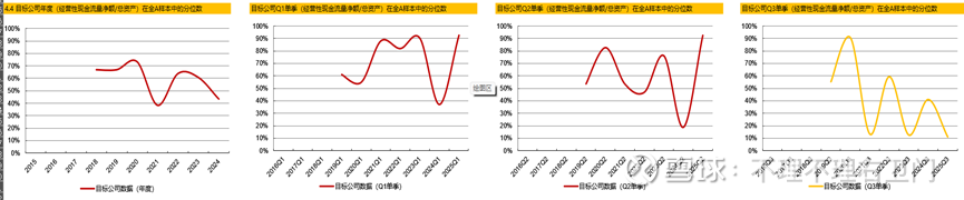 2-现金流创造能力:公司经营性现金流量净额/总资产在全A样本中的历史分位数走势,该比率从2022年开始持续下滑,25年前2个季度有所上升,三季度又下滑,整体公司资产创造现金流能力较弱。