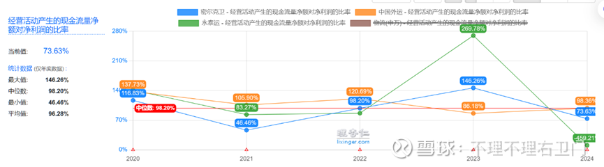 3-净利润的现金含量公司一般,经营现金流/净利润平均值96%,但波动较大,不如中国外运稳定,优于永泰运。