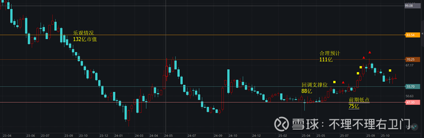 根据天花板利润估算,预计天花板利润为现在的1.8倍(24年5.7亿,对应天花板10亿附近),对应估值在14-21倍,25年预计利润6.3亿,对应市值区间88-132亿,基本与DCF的99-132亿区间差不多。
