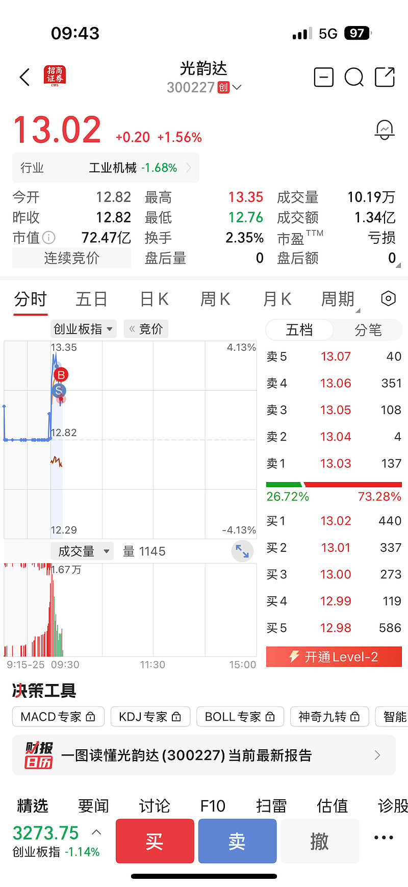 量能不对,前面股價是高,但是量能越來越少,拐角後再次拉升但是量能對比前面是3分鐘是多倍量的,碼字的時候剛好看到跌到13.00元,果斷再次入場