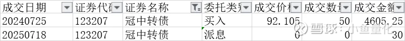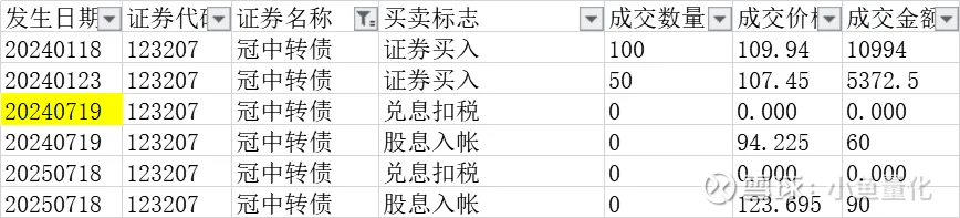 下表是小鱼在冠中转债上的交易记录,冠中转债的买入是在去年1月份,以及去年7月份,总计买入了200张,经过分红后,成本为104元左右,因为是在两个证券账号中买入的,所以交易记录分为了两个表格。第二次买入也接近了去年可转债熊市的最底部,只是第二次买入的数量不多只有50张。