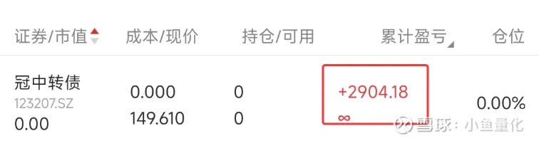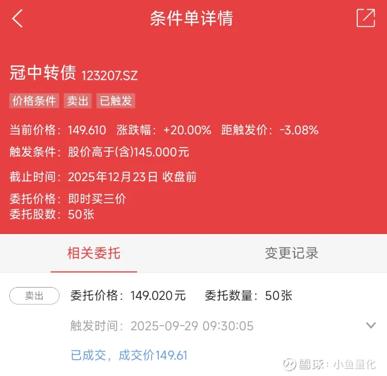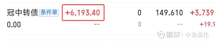 今天复盘后冠中转债直接20cm涨停,最终两个账户的条件单都在149.61元成交,比我设置145元的条件单高了4.61元,多赚了900多呢。这样持仓200张的冠中转债最终盈利约9100元,盈利百分位为43.7%多点。