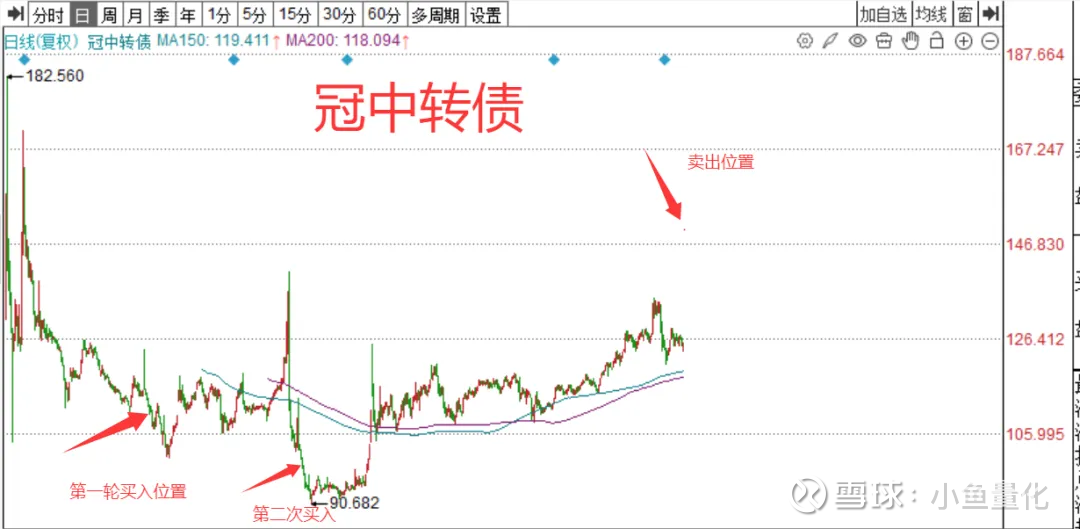 冠中转债的买入区间位置,以及卖出位置我都标注在了K线图上。