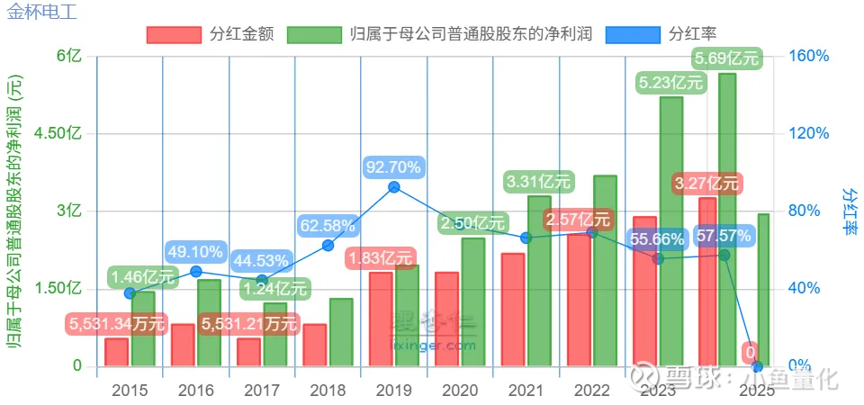大家看下图,金杯电工近十年净利润和分红情况,其中2015年~2018年,这四年分红率在50%~60%区间,且分红金额相当稳定,都在5000万~8000万元区间。之后几年随着净利润的上升,分红也开始水涨船高,大体维持了2~3亿元的分红。