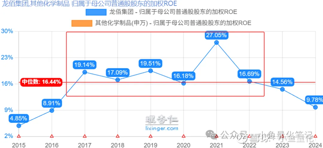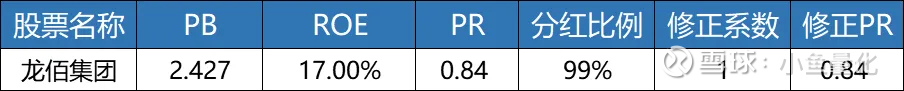小鱼先计算一下龙佰集团的市赚率PR。龙佰集团属于化工行业,有很强的周期属性,我们用市赚率的变形公式来计算,即PR=PB/(ROE^2*100)。