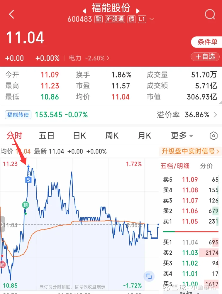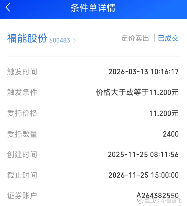 福能股份2024年报分红8.62亿元,即每股分红0.31元,我大体想在福能股份股息率降低到2.8%附近时候卖出,也就是0.31/2.8%=11.1元。后来就定了一个11.2元的卖出条件单。