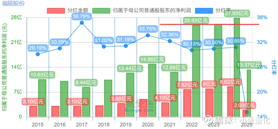 福能股份主营业务中大约有95%是电力业务,属于公共事业板块。通过下图历年净利润可以看到2022~2024年公司净利润上了一个大台阶,保持在25亿元上方,2025年前三季度净利润也达到了19亿多,全年估计也能有25亿以上。其他基本面数据还是很能打的,不多说了。