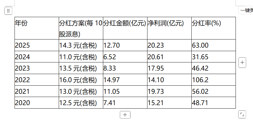 从表中可见,公司分红政策极为稳定且慷慨,近六年每年均实施年报分红,分红金额与净利润相比呈现较高比例。特别是2025年,尽管归母净利润同比微降1.84%,但公司仍保持高分红,每10股派发现金红利14.30元,分红率达63.00%,加上股份回购金额5.795亿元,现金分红和股份回购总金额达18.49亿元,占净利润的比例高达91.40%。这种高分红比例体现了公司管理层对股东回报的高度重视。