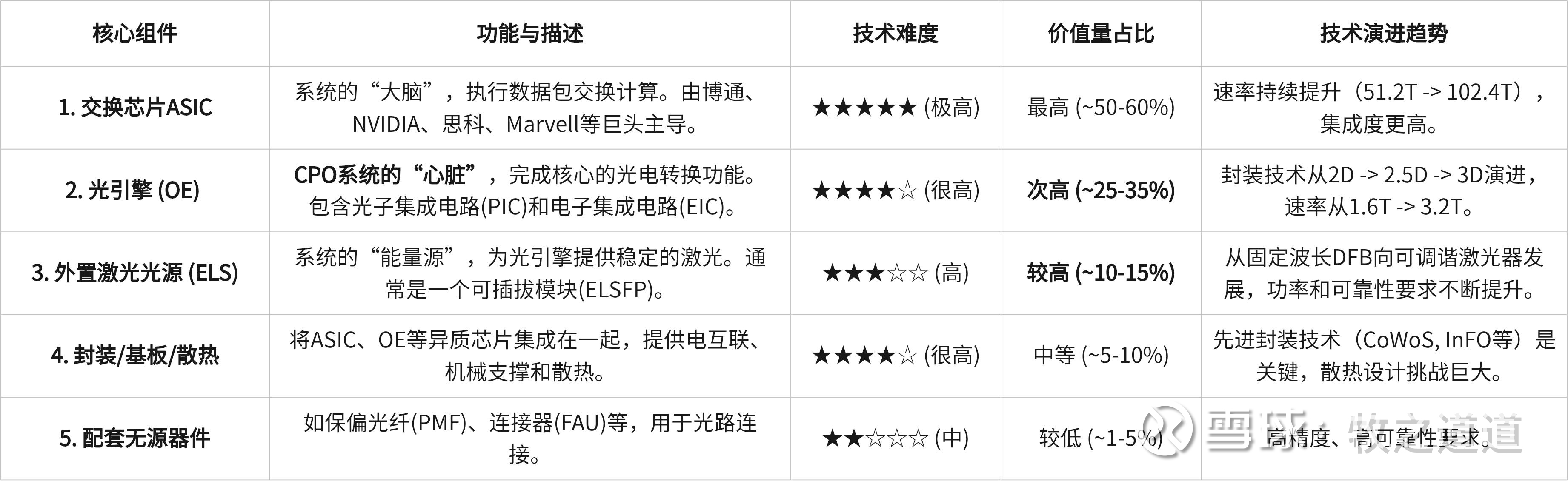 一个CPO交换机系统可以拆解为以下几个核心部分,其价值量和技术难度各不相同,这个很重要,大A公司能参与的主要就是2~4: