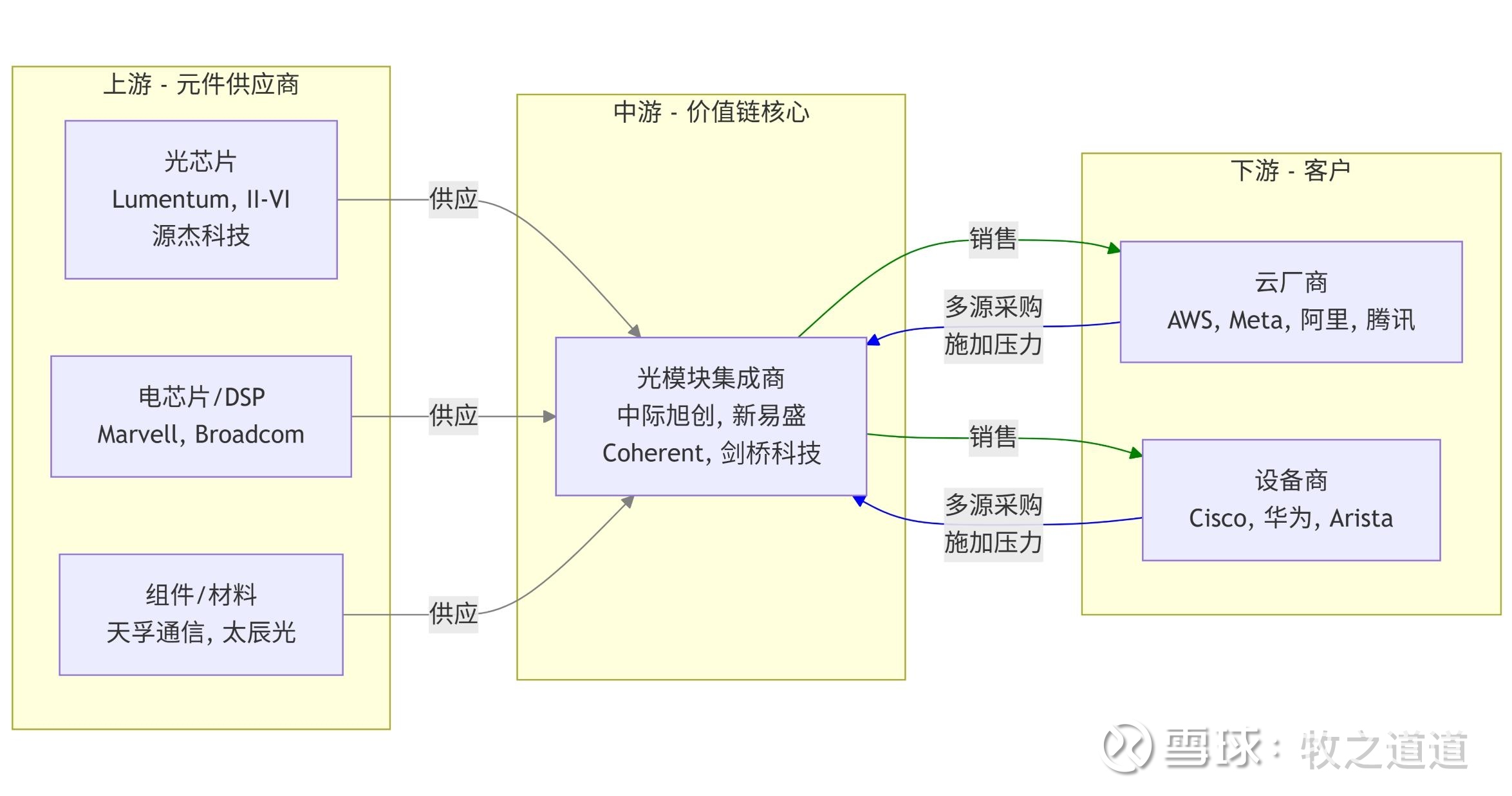 1.在目前的光模块时代:产业链是横向分工的,芯片、组件、模块、设备各个层级分工明确,通过标准接口(MSA)耦合。这使得中游的模块集成商(如中际旭创、新易盛)成为核心枢纽,它们整合上游资源,为下游多个客户服务,市场相对开放和竞争