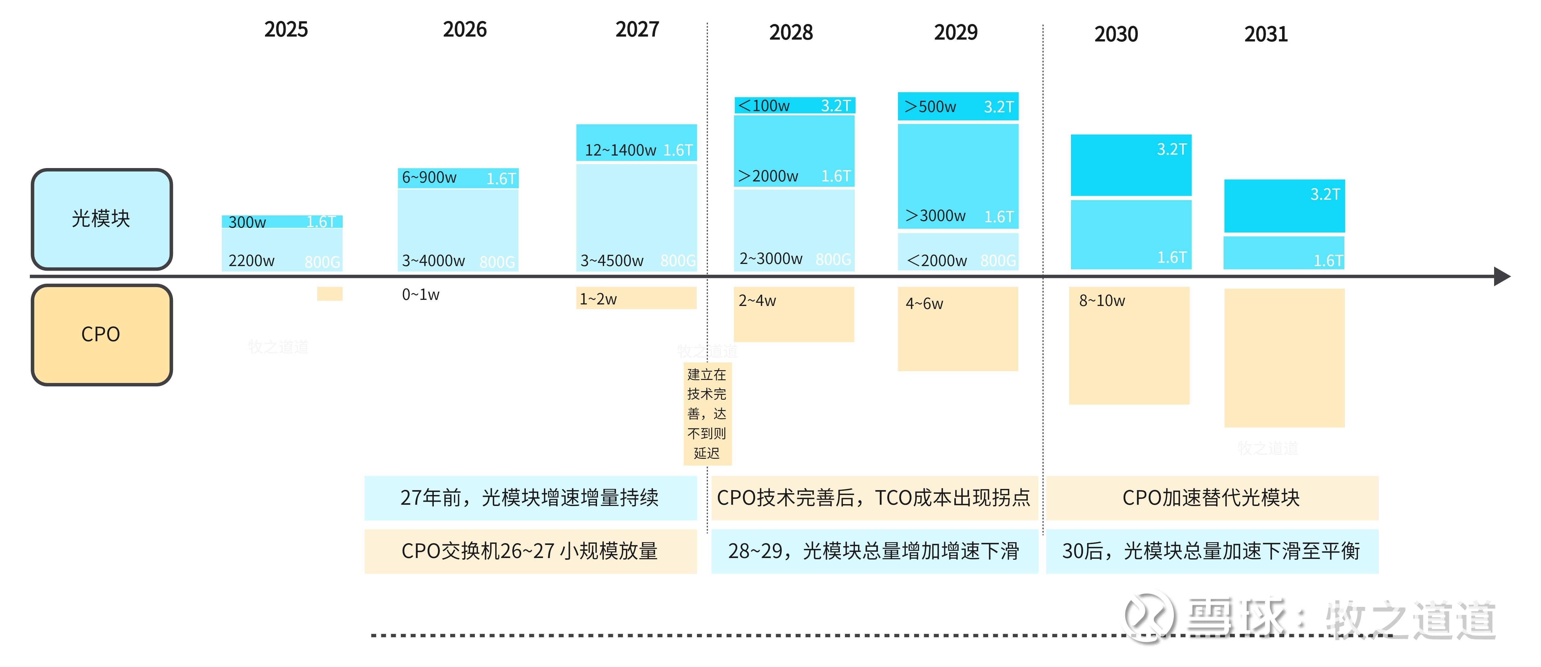 在当下25年,对CSP厂商来说,光模块的成本就是最划算的,在图中交会的27年,这就是建立在27年乐观技术预期的情况下,市场的乐观预期交叉点,那个时候CPO的TCO成本超过光模块。但是如果未来CPO的各种因素没办法提升其TCO,那么这个交叉点就会延后。站在当下,从市场已经各大厂家的乐观预估下,27年可能是最积极的年份,不少可能都看到28,29年。