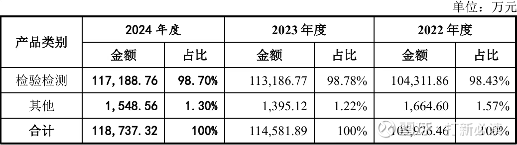 2024年,公司收入按业务类别可分为两大板块,分别为检验检测(11.72亿元,98.70%)、以及其他主营业务(0.15亿元,1.30%)。2022年至2024年间,检验检测业务始终为公司的主要收入来源、其收入占比稳定 95%以上;整体业务结构稳定,并未发生重大变动。