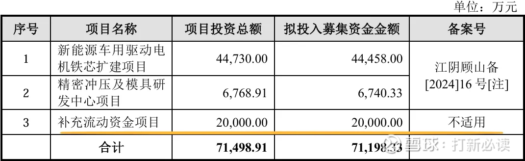 本此拟募资用途:项目总投资资金7.12亿,其中4.45亿用与新能源车用驱动电机铁芯扩建项目,0.67亿用与精密冲压及模具研 发中心项目,2亿用于补充流动性资金,具体项目如下: