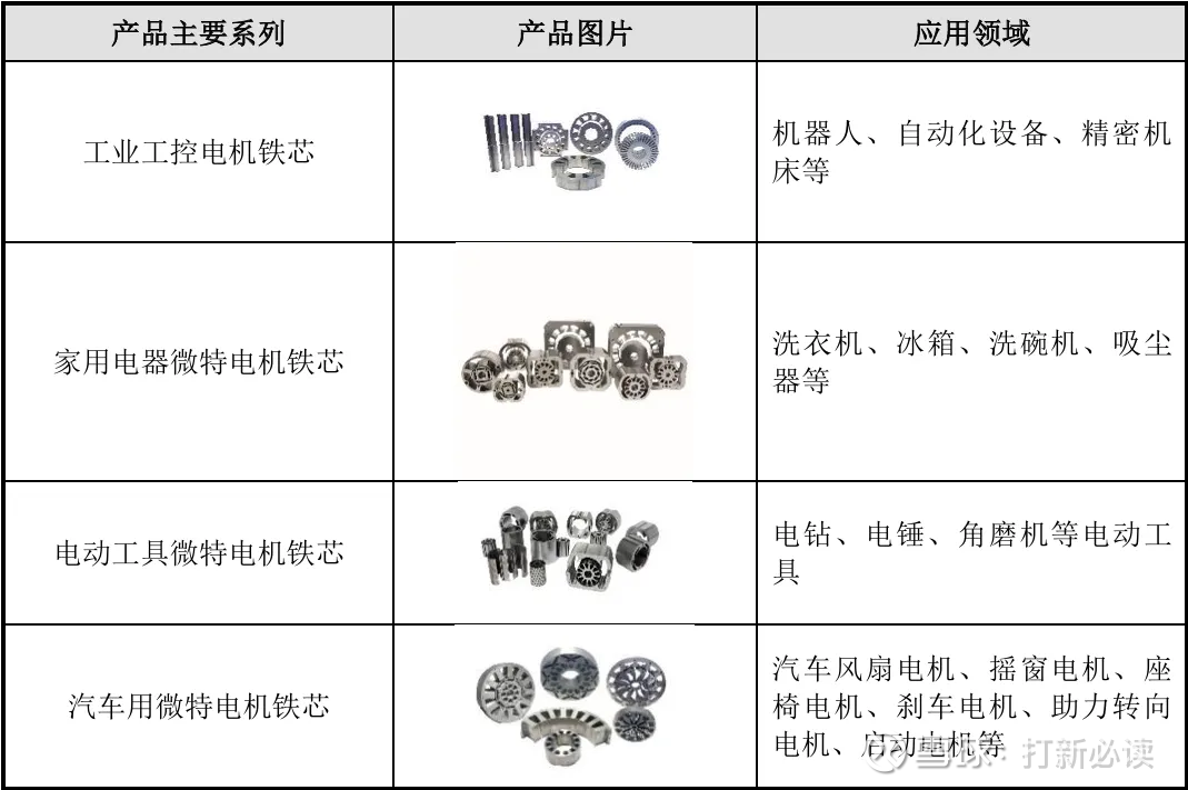 其中,精密冲压铁芯是公司的主要产品,可分为新能源汽车驱动电机铁芯、微特电机铁芯电气设备铁芯、点火线圈铁芯等多种类型,主要供应给国内外众多大型汽车零部件厂商、电机制造厂商、电气设备制造厂商、汽车整车厂等各类企业;同时,公司还会向客户提供生产铁芯产品所需的精密冲压模具。