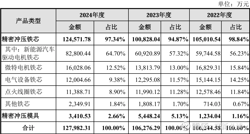 2024年,公司收入按业务类别可分为两大板块,分别为精密冲压铁芯(12.46 亿元,97.34%)以及精密冲压模具(0.34亿元,2.66%)。2022年至2024年间,精密冲压铁芯业务始终为公司的主要收入来源、其收入占比稳定 90%以上,其中又以新能源汽车驱动电机铁芯产品为主体、占据50%以上的收入份额。