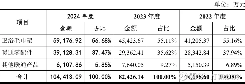 2024年,公司收入按产品类别可分为三大板块,分别为卫浴毛巾架(5.92亿元,占2024年主营收入的 56.68%)、暖通零配件(3.91 亿元,占 2024 年主营收入的 37.47%)、其他暖通产品(0.61亿元,占2024年主营收入的5.85%)。2022年至2024年间,卫浴毛巾架始终为公司的主要收入来源、其收入占比稳定50%以上,整体收入结构较为稳定。