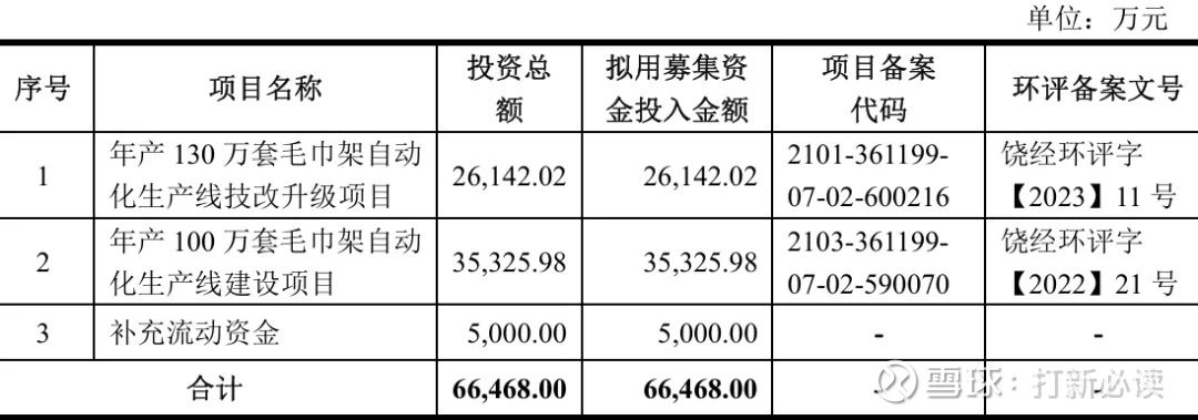 本此拟募资用途:项目总投资资金6.65亿,其中2.61亿用与年产130万套毛巾架自动化生产线技改升级项目,3.53亿用与年产100万套毛巾架自动化生产线建设项目,0.5亿用于补充流动资金,具体项目如下: