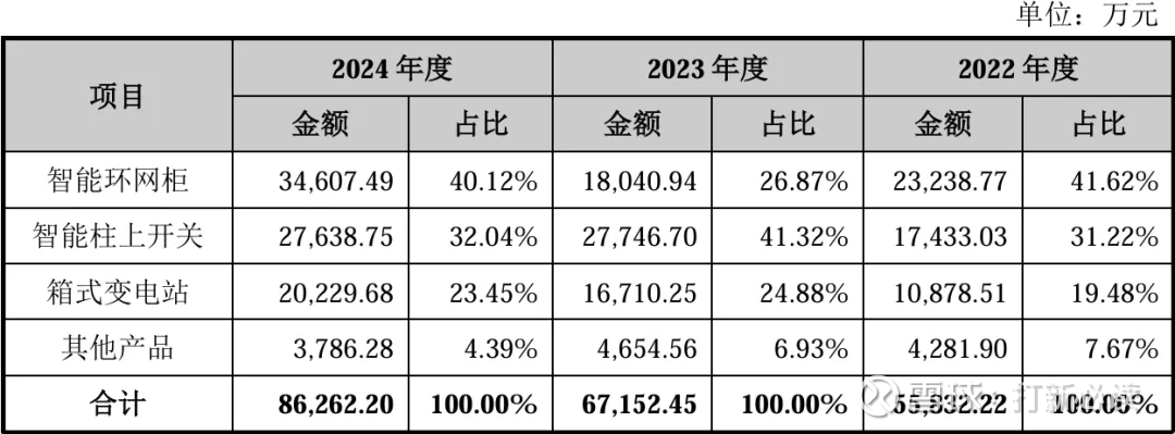 2024年,公司收入按业务类别可分为四大板块,分别为智能环网柜(3.46亿元,40.12%)、智能柱上开关(2.76 亿元,32.04%)、箱式变电站(2.02 亿元,23.45%)、其他产品(0.38%,4.39%)。2022年至 2024年间,智能环网柜与智能柱上开关始终为公司的主要收入来源,合计收入占比稳定65%以上,整体业务结构并未发生重大变动。