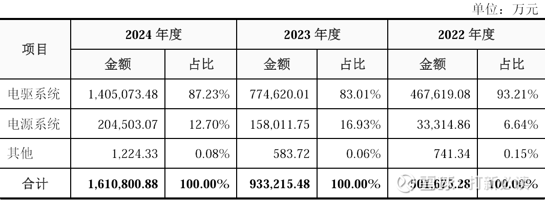 2024年,公司收入按产品类别可分为三大板块,分别为电驱系统(140.51亿元,87.23%)、电源系统(20.45 亿元,12.70%)、其他产品(0.12亿元,0.08%);目前,电驱系列是公司的主要收入来源,其收入占比在 80%以上。