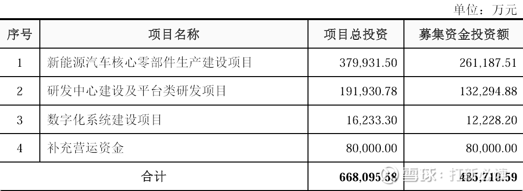 本此拟募资用途:项目总投资资金48.57亿,其中26.12亿用与新能源汽车核心零部件生产建设项目,13.23亿用与研发中心建设及平台类研发项目,1.23亿用于数字化系统建设项目,8亿用于补充营运资金,具体项目如下: