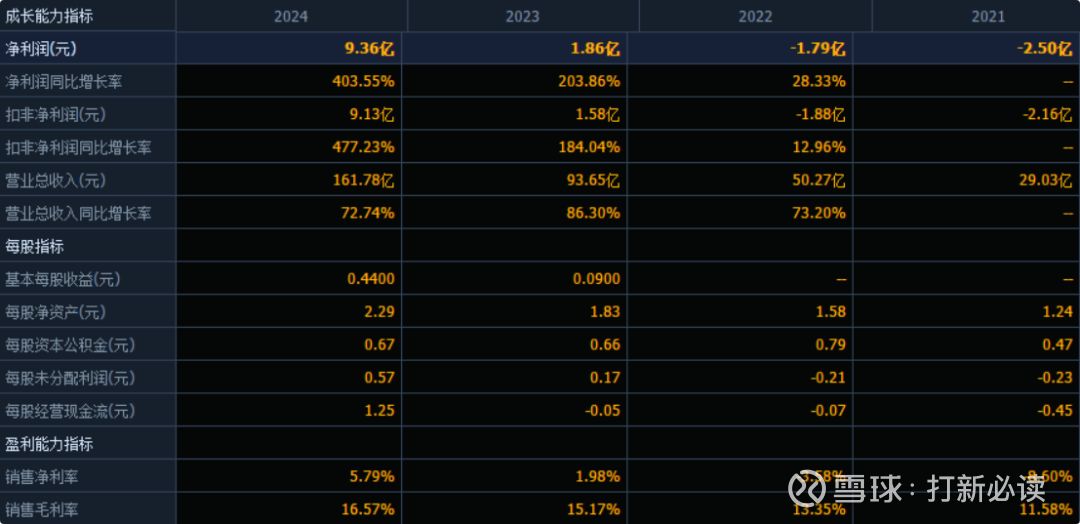 公司 2022-2024年分别实现营业收入50.27亿元/93.65亿元/161.78亿元,增长率依次为73.20%/86.30%/72.74%;实现归母净利润-1.79亿元/1.86亿元/9.36亿元,增长率依次为28.33%/203.86%/403.55%。