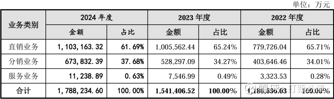 2024年,公司收入按业务类别可分为三大板块,分别为直销业务(110.32亿元,61.69%)、分销业务(67.38 亿元,37.68%)、服务业务(1.12亿元,0.63%);目前,公司以直销业务为主收入占比在 60%以上。