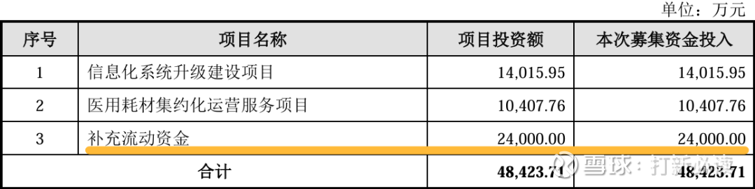 本此拟募资用途:项目总投资资金4.84亿,其中1.4亿用与信息化系统升级建设项目,1.04亿用与医用耗材集约化运营服务项目,2.4亿用于补充流动性资金,具体项目如下: