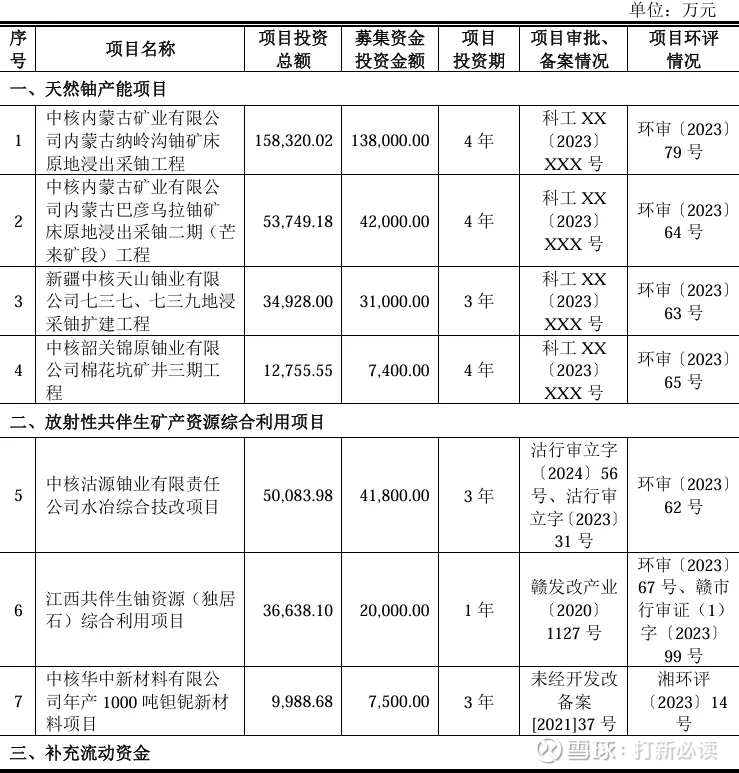 本此拟募资用途:项目总投资资金41.1亿,其中13.8亿用于中核内蒙古矿业有限公 司内蒙古纳岭沟铀矿床 原地浸出采铀工程,4.2亿用于中核内蒙古矿业有限公 司内蒙古巴彦乌拉铀矿 床原地浸出采铀二期(芒 来矿段)工程,3.1亿用于新疆中核天山铀业有限 公司七三七、七三九地浸 采铀扩建工程,0.74亿用于中核韶关锦原铀业有限 公司棉花坑矿井三期工 程,4.18亿用于中核沽源铀业有限责任 公司水冶综合技改项目,2亿用于江西共伴生铀资源(独居 石)综合利用项目,0.75亿用于中核华中新材料有限公 司年产1000吨钽铌新材 料项目,12.33亿用于补充流动资金,具体项目如下: