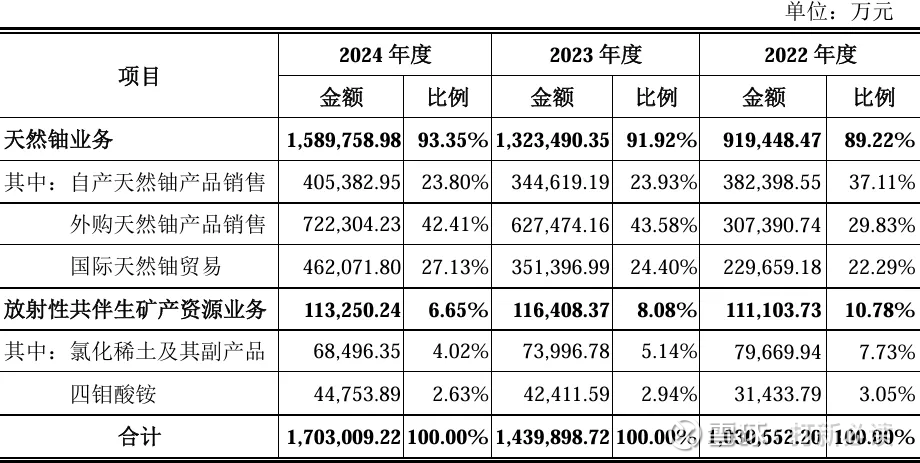 2024年,公司主营业务收入按业务类别可分为两大板块,分别为天然铀业务(158.98亿元,占 2024年主营收入的93.35%)、放射性共伴生矿产资源业务(11.33亿元,占2024年主营收入的 6.65%)。2022 年至 2024年,天然铀业务始终为公司最主要的收入来源、其收入占比稳定在85%以上;而在天然铀业务中,2023年以来外购天然铀产品销售为主要构成。