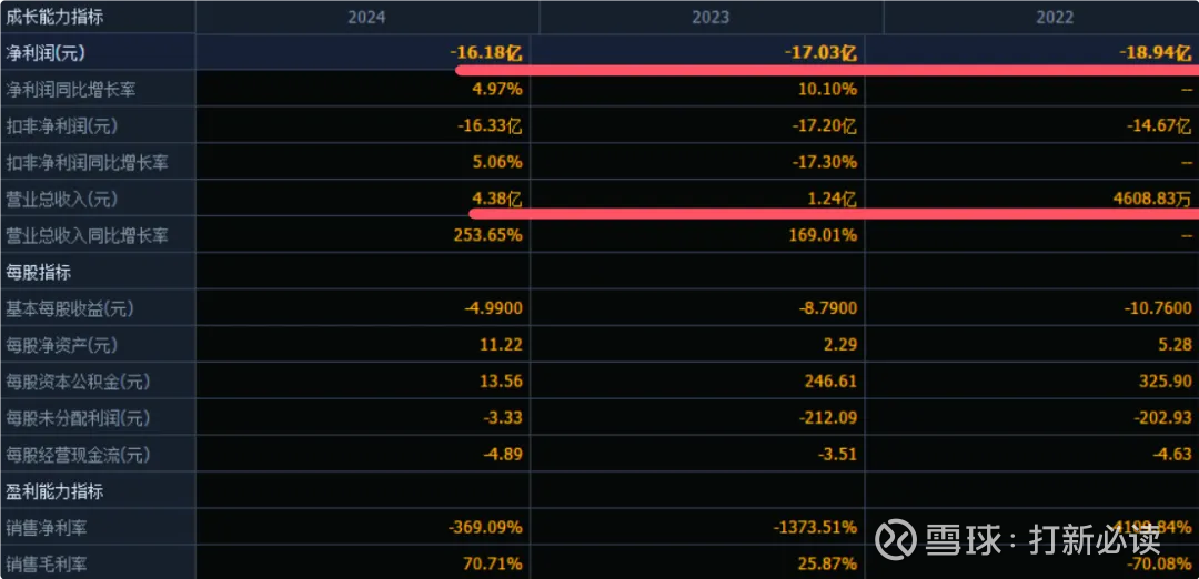 公司 2022-2024年分别实现营业收入0.46亿元/1.24亿元/4.38亿元,增长率依次为-%/169%/253.65%;实现归母净利润-18.94亿元/-17.03亿元/-16.18亿元,增长率依次为-%/10.10%/4.97%。